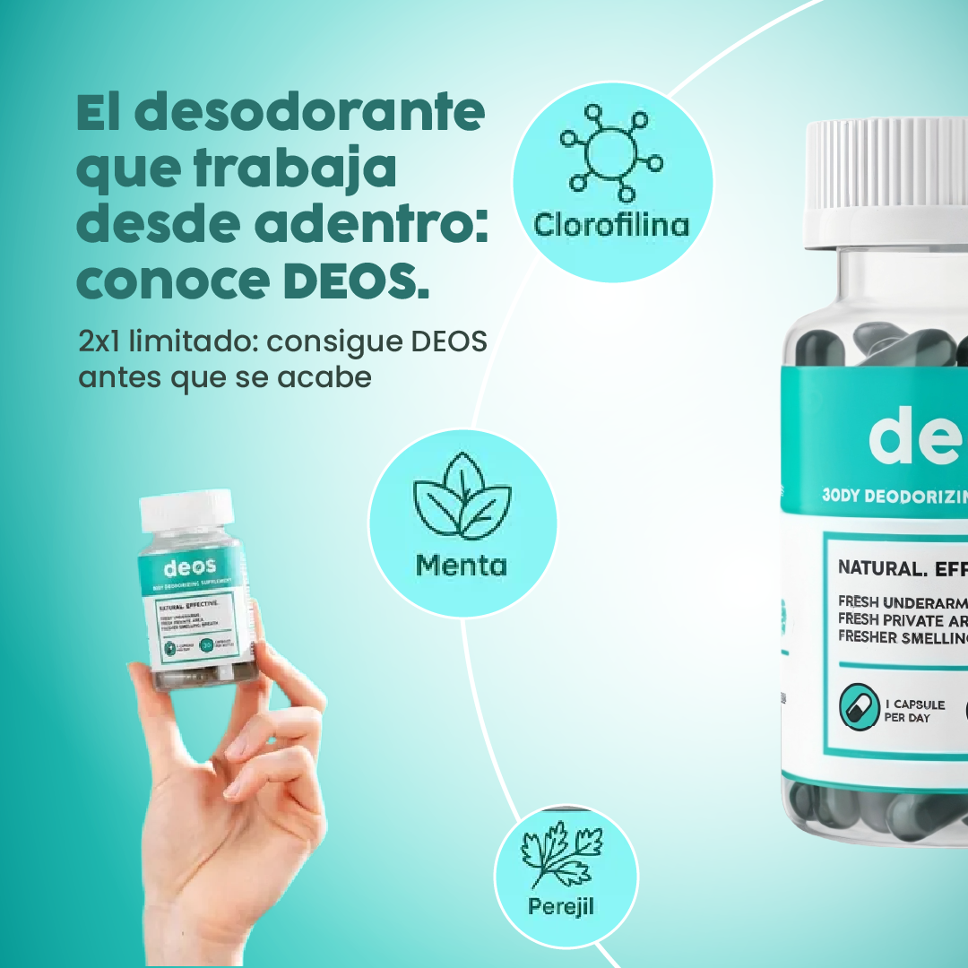 DEOS tiene clorofilina que neutraliza olores corporales y mal aliento, el perejil desintoxicación, y la menta deja una sensación de frescura duradera.