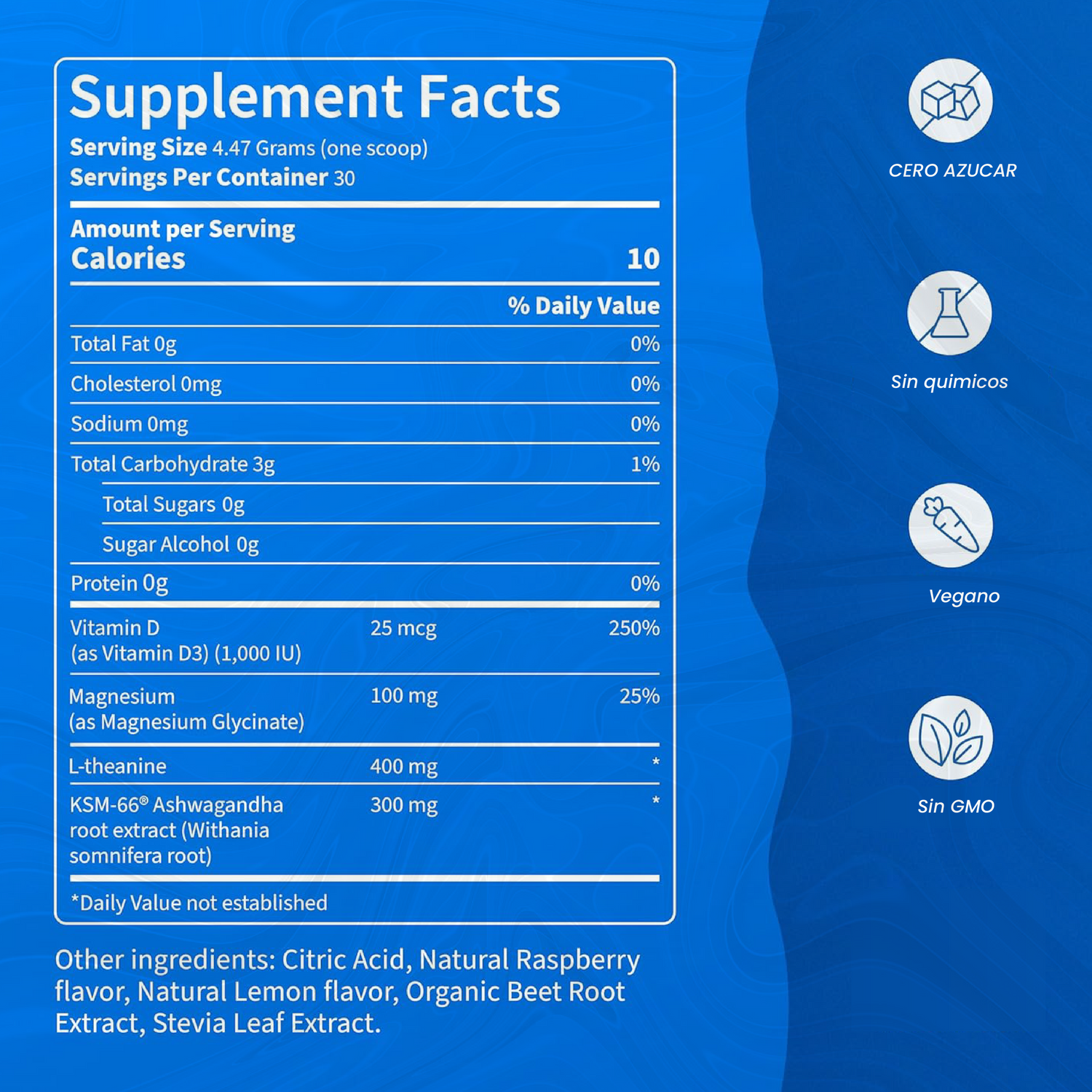 Incluye Ashwagandha KSM-66, Magnesio Glicinato, L-teanina y Vitamina D3, seleccionados por su eficacia comprobada en reducir el estrés, mejorar el sueño y potenciar el rendimiento mental.